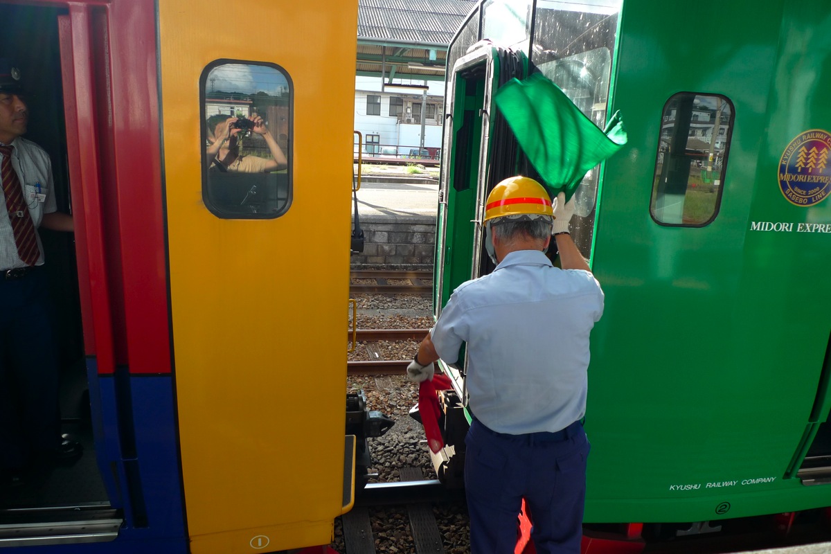 4枚目の写真は早岐駅での特急みどり号とハウステンボス号の連結作業。 鉄道好きにはたまりません。特にこの色の組み合わせが… あ、窓に自分が映ってる…