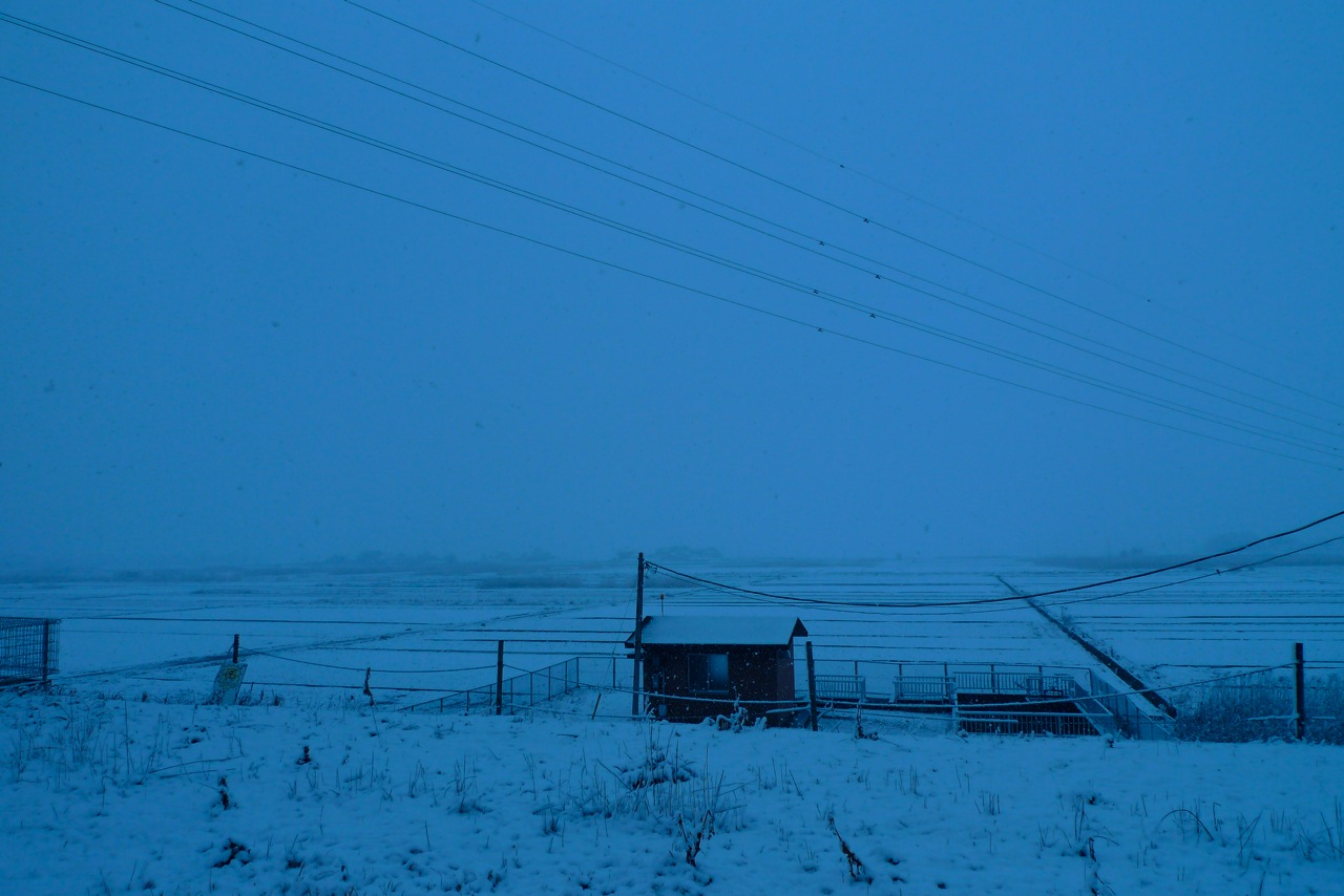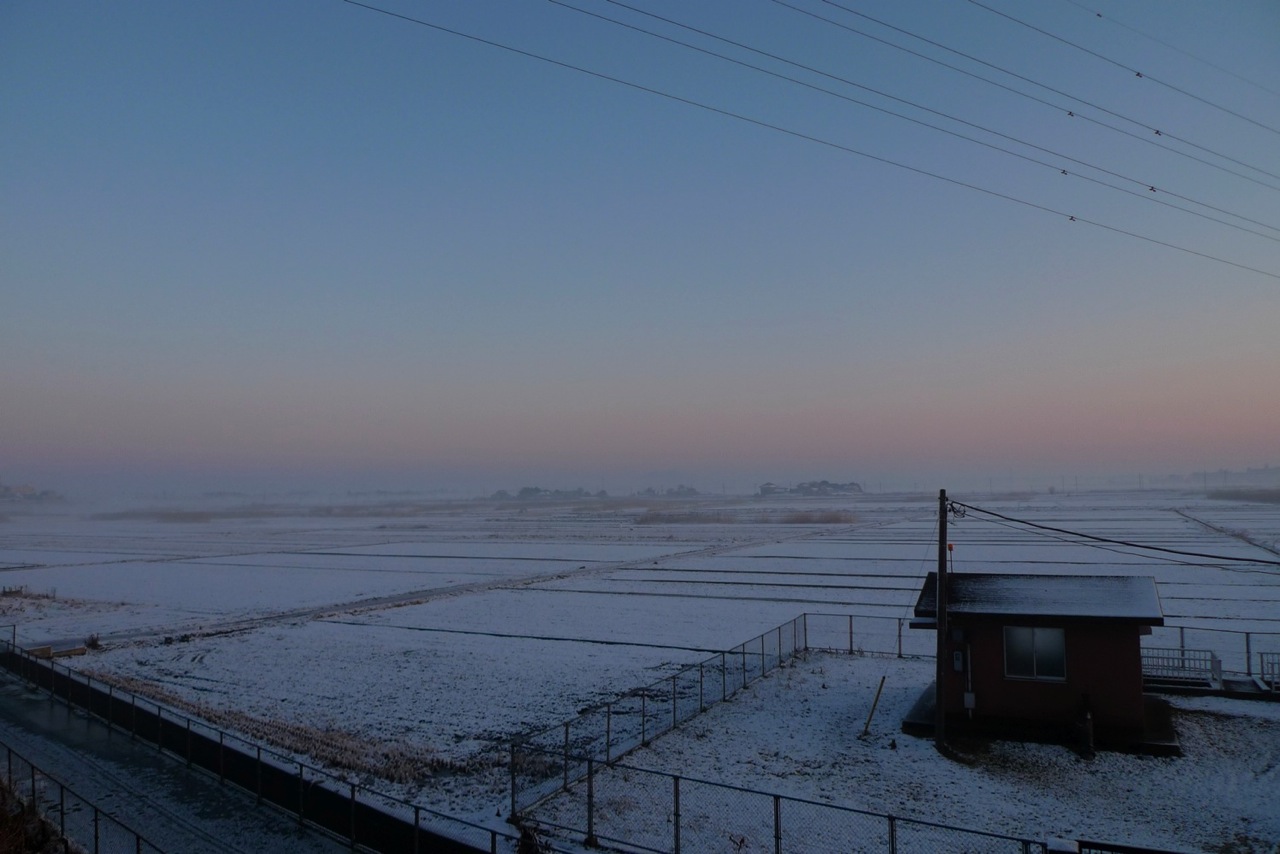 雪の日の日の出と大雪の写真です。