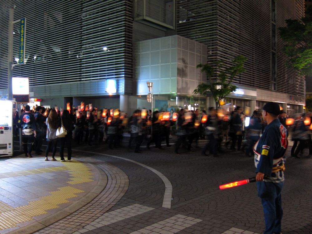 写真は御神輿と、夜中町を練り歩く太鼓とラッパの提灯行列。